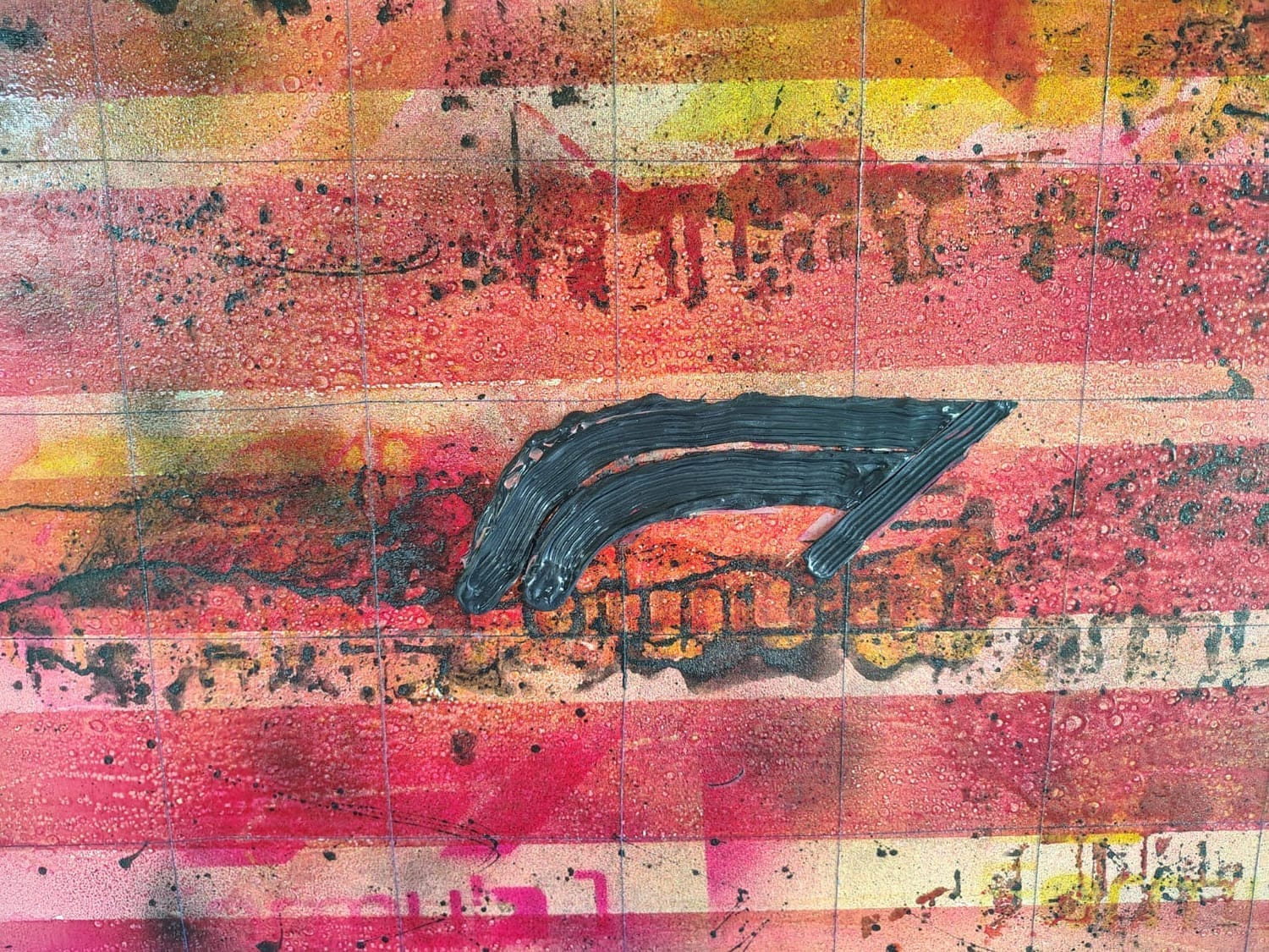 Primera obra de la serie que indaga la transformación de símbolos del diseño en materia artística mediante técnicas mixtas, capas de color y texturas experimentales.