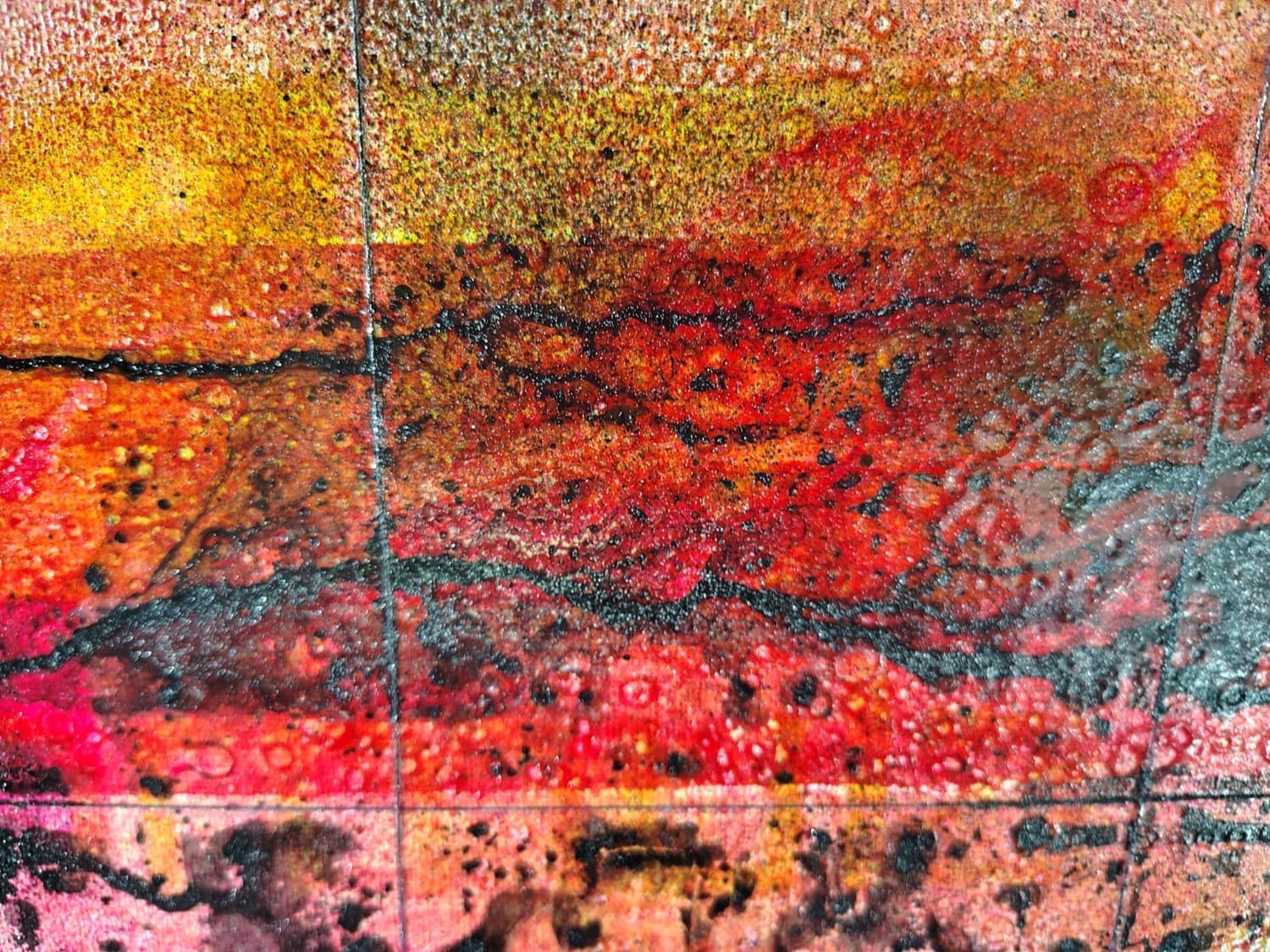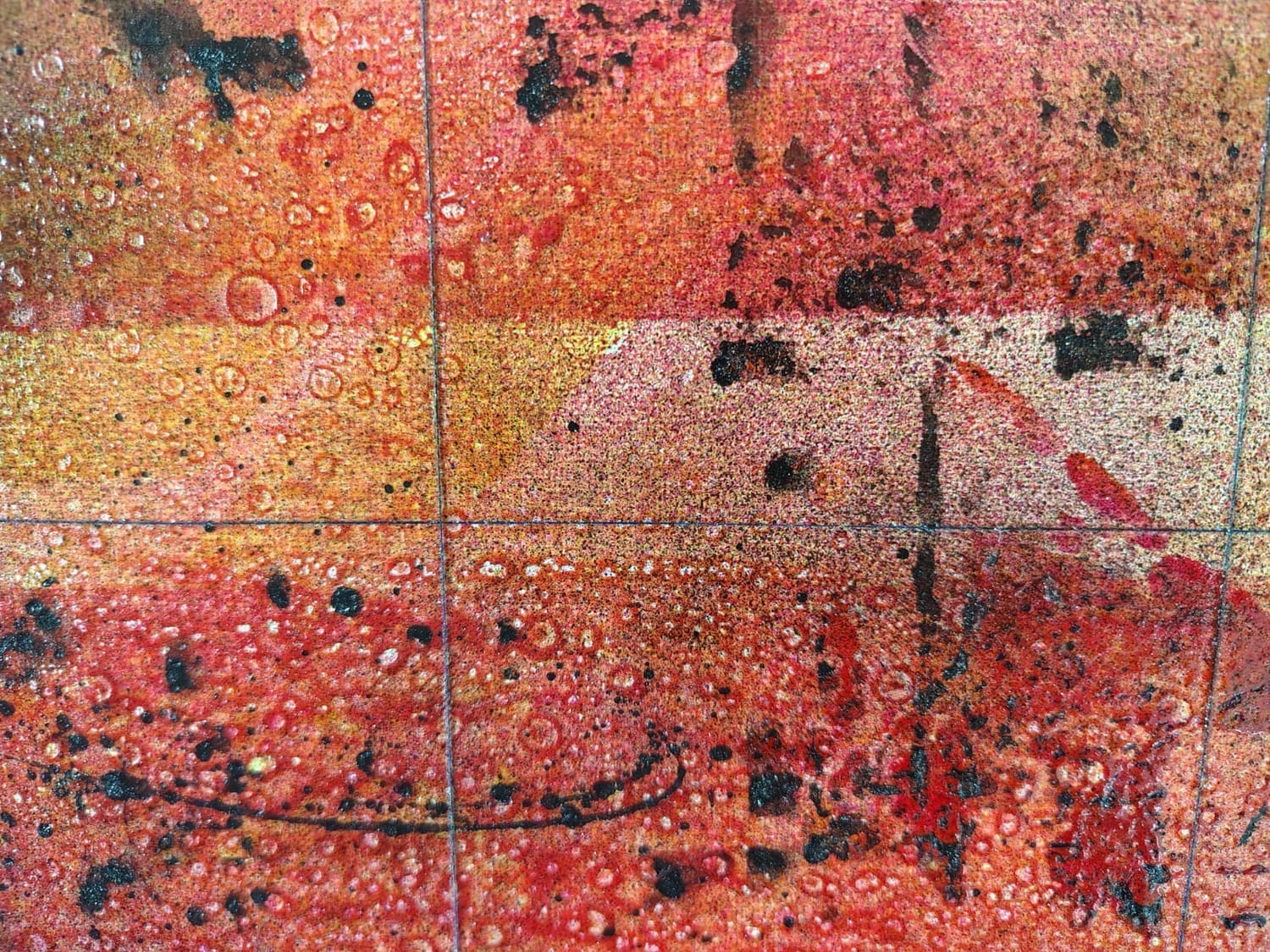 La obra combina microrrelieves, spray, acrílico y pigmentos que trabajan en tensión: lo geométrico y lo corporativo frente a lo gestual, lo intuitivo, lo femenino. Las franjas y cuadrículas sugieren el orden del diseño, mientras que el color—cargado, cálido, visceral—interrumpe ese orden para transformarlo.