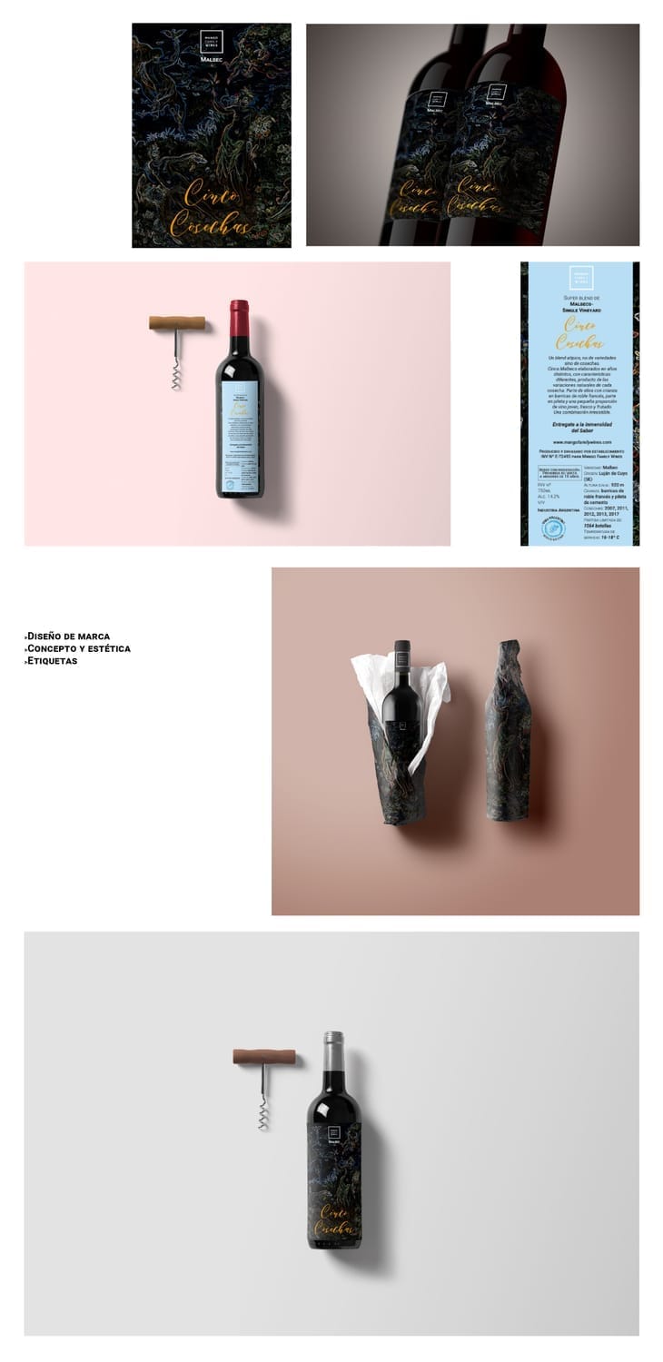 Creé el concepto visual completo para esta línea de vinos, desarrollando la identidad estética, la etiqueta principal, contrarrótulo y el envoltorio. El proyecto se centró en transmitir elegancia, carácter y una impronta contemporánea a través de composición, tipografía y gestualidad.